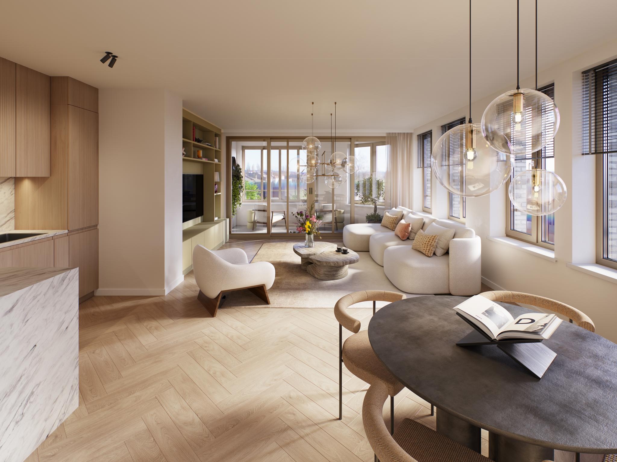 Boven de levendige commerciële plint en de gezamenlijke thuiswerkkamer bevinden zich drie stijlvolle appartementen op de eerste verdieping en twee op de tweede verdieping. De drie- en vierkamer appartementen variëren van ca. 67-107 vierkante meter woonoppervlakte. Met onder andere heerlijke loggia’s geniet je van je privé buitenruimte, terwijl de doorlopende plantenbakken op de luifel een eigen groene oase creëren.