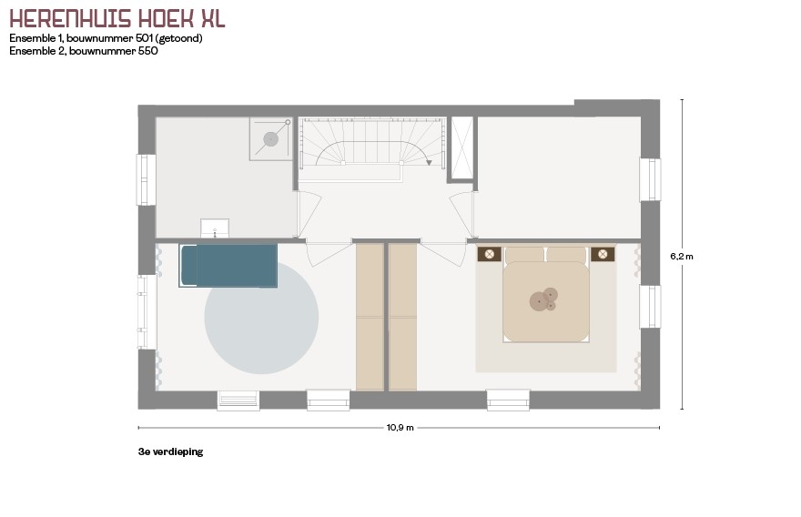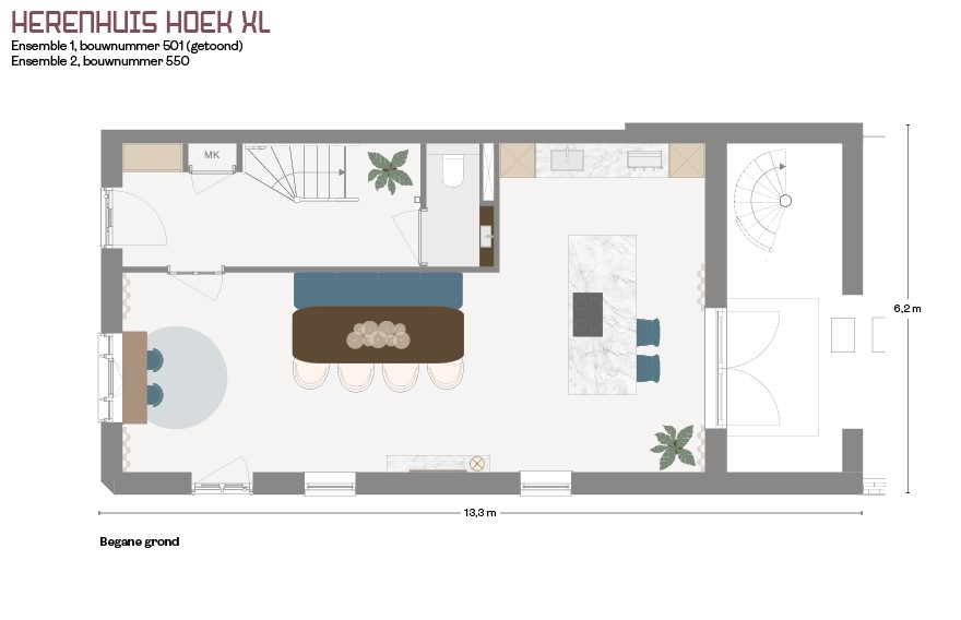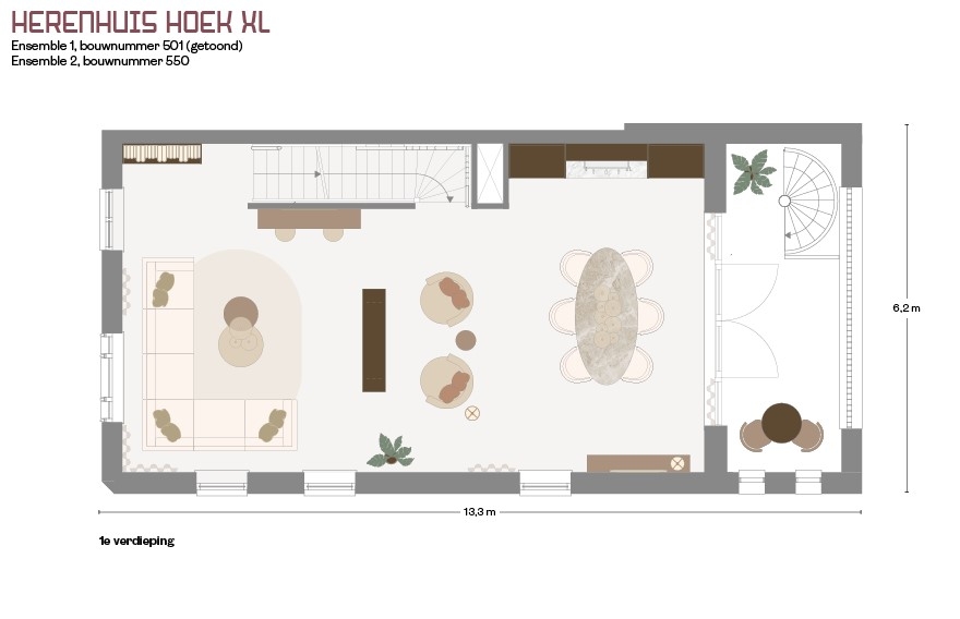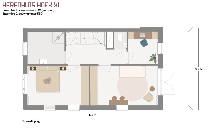 Bouwnummer 550 in Ensemble 1 is ontworpen door V8 Architects, terwijl Braaksma & Roos bouwnummer 550 in Ensemble 2 tekende. Beide architectenbureaus hebben hoog ingezet op ambachtelijk vormgegeven details. De rijkheid die hierdoor in de gevel ontstaat, geeft het huis een statig karakter – een woning om trots op te zijn.