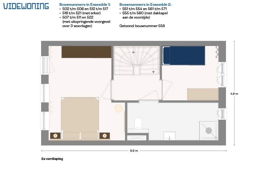 Een bijzonder detail is de vide, die de begane grond en de 1e verdieping met elkaar verbindt. Zo kun je je even terugtrekken zonder echt afgesloten te zijn. Dankzij de speelse indeling en 4 slaapkamers is de Videwoning ideaal voor een gezin met pubers – iedereen een eigen plek – maar ook perfect als je met z’n tweeën bent en geregeld logees ontvangt.