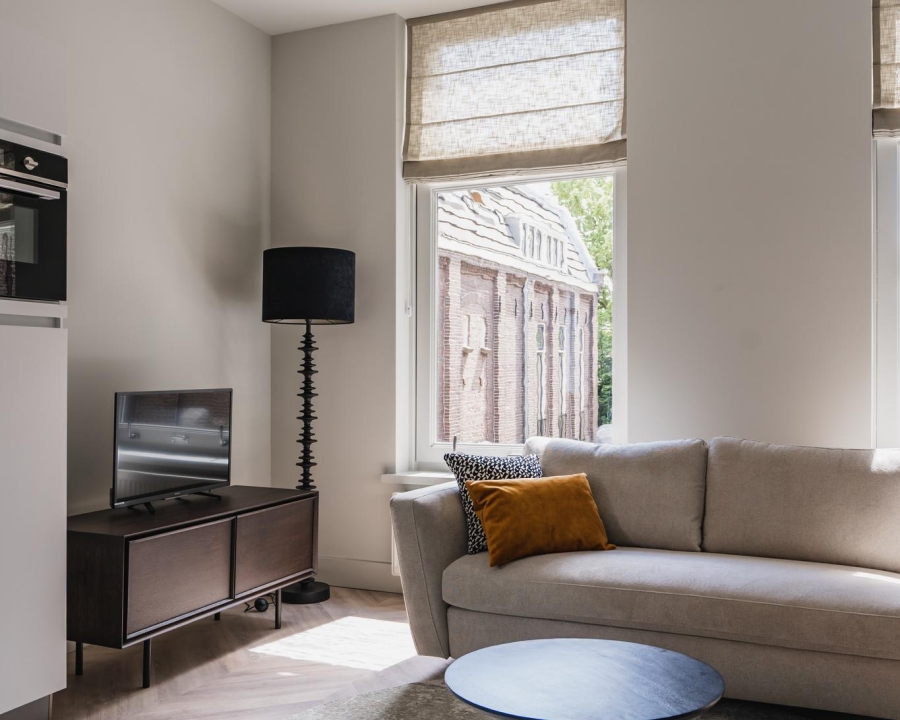 In de monumentale Pastorie aan de Hoge Gouwe in Gouda komen historie en modern comfort prachtig samen. Dit karakteristieke pand is stijlvol gerenoveerd, waarbij authentieke charme behouden bleef en aangevuld werd met eigentijdse voorzieningen. In dit bijzondere gebouw bevindt zich Appartement Kartuizer, een instapklaar en volledig gemeubileerd appartement dat dankzij de verdeling over twee woonlagen een aangename scheiding tussen leven en slapen biedt.