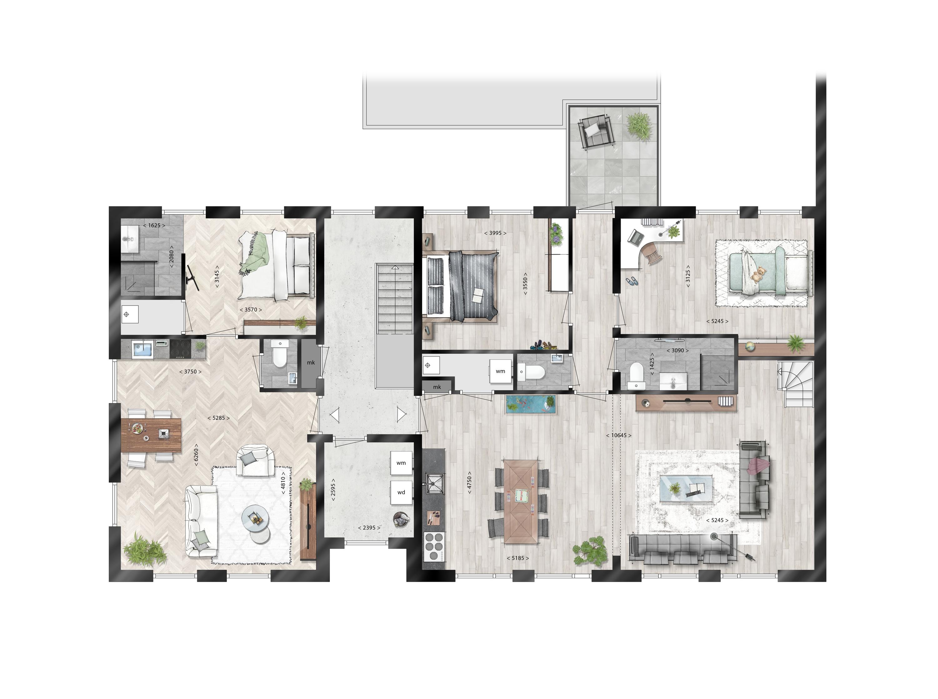 Op straatniveau een 2 en een 3 kamer appartement van respectievelijk 50 m² en 101 m². Perfect voor starters of juist de volgende stap waarbij het gemak van gelijkvloers wonen ideaal is. Type M (3 kamer appartement) heeft daarnaast óók nog eens een heerlijke tuin van ca. 19 m², gesitueerd op het zuidoosten. The best of both worlds. Op de 1e verdieping een 2 kamerappartement (50 m²) en het ongekend luxe TOP-appartement van het project: Type O (bouwnummer 28) heeft 2 woonlagen, waarvan de 2e laag een Entresol is van maar liefst 42 m²! Het hele woonoppervlak bedraagt 142 m². Werkelijk enig in zijn soort!