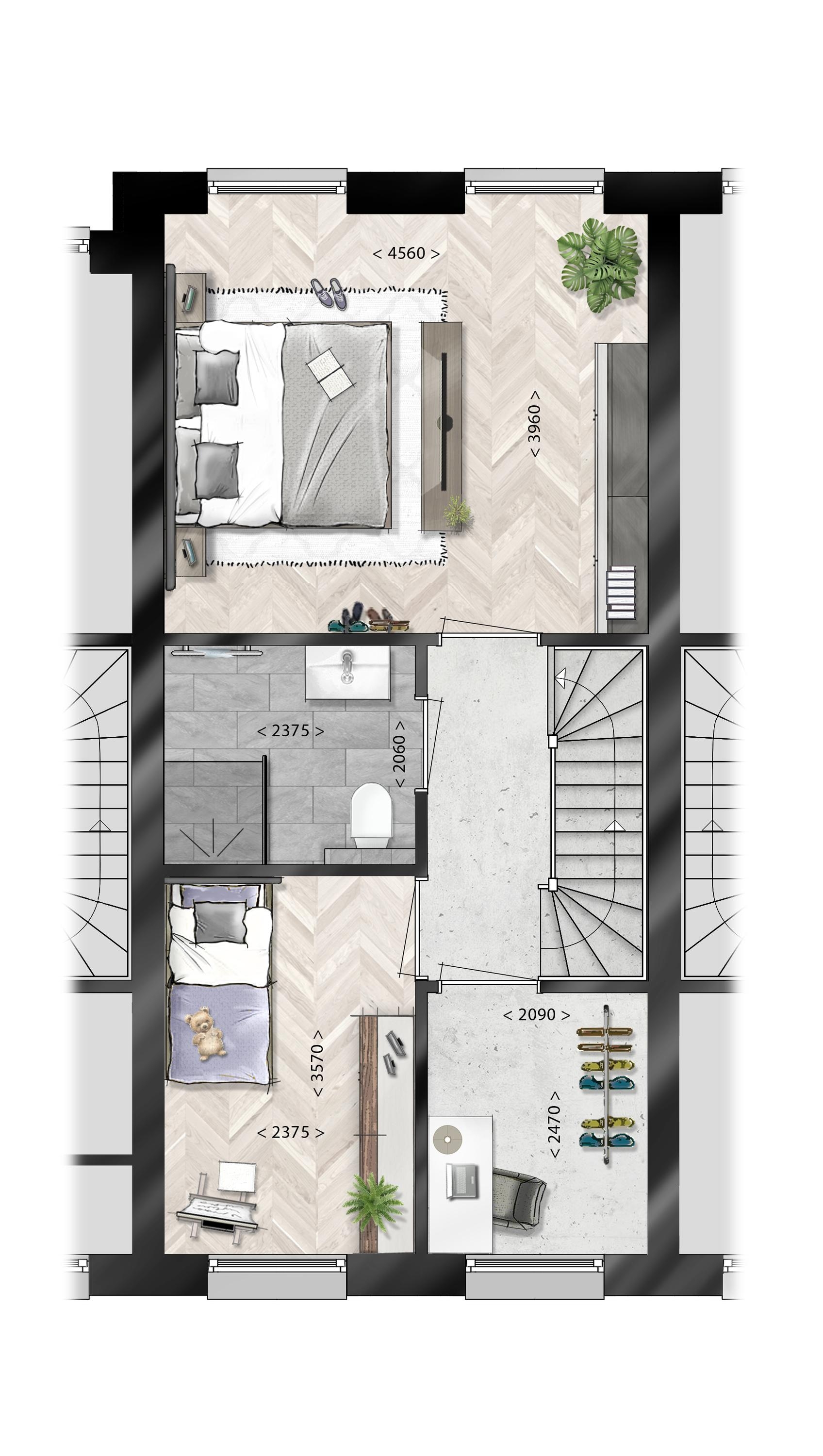 Hoekwoning (Type A, bouwnummer 01) heeft een afwijkende opzet. Deze woning is gesitueerd naast de entree van gebied en heeft een eigen parkeerplek. En in plaats van een tuin beschikt deze speelse woning over een heerlijk buitenterras op de 2e verdieping. Fantastisch!