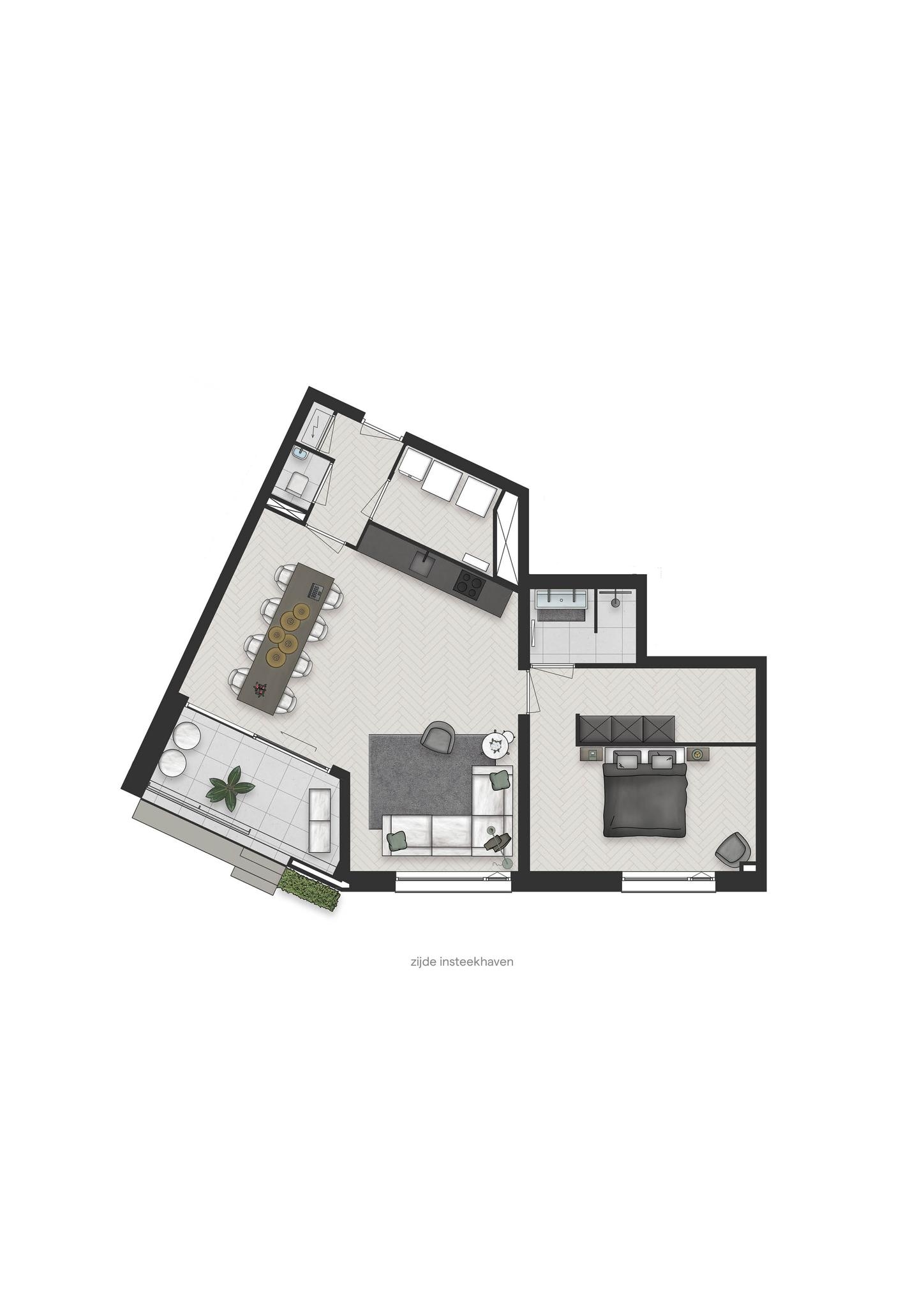 De entree op de kop van de haven, brengt u direct vanuit uw woonomgeving op de autoluwe kade. Vanuit hier voelt u de zachte bries over de rivier gaan, terwijl u rustig richting het centrum wandelt.