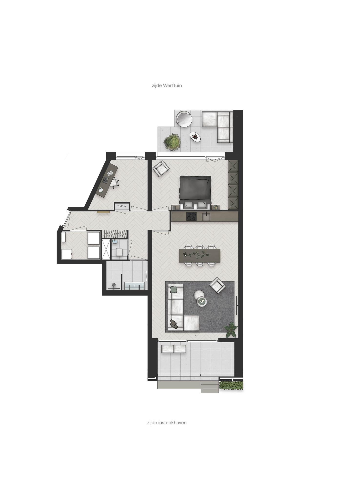 De entree op de kop van de haven, brengt u direct vanuit uw woonomgeving op de autoluwe kade. Vanuit hier voelt u de zachte bries over de rivier gaan, terwijl u rustig richting het centrum wandelt.