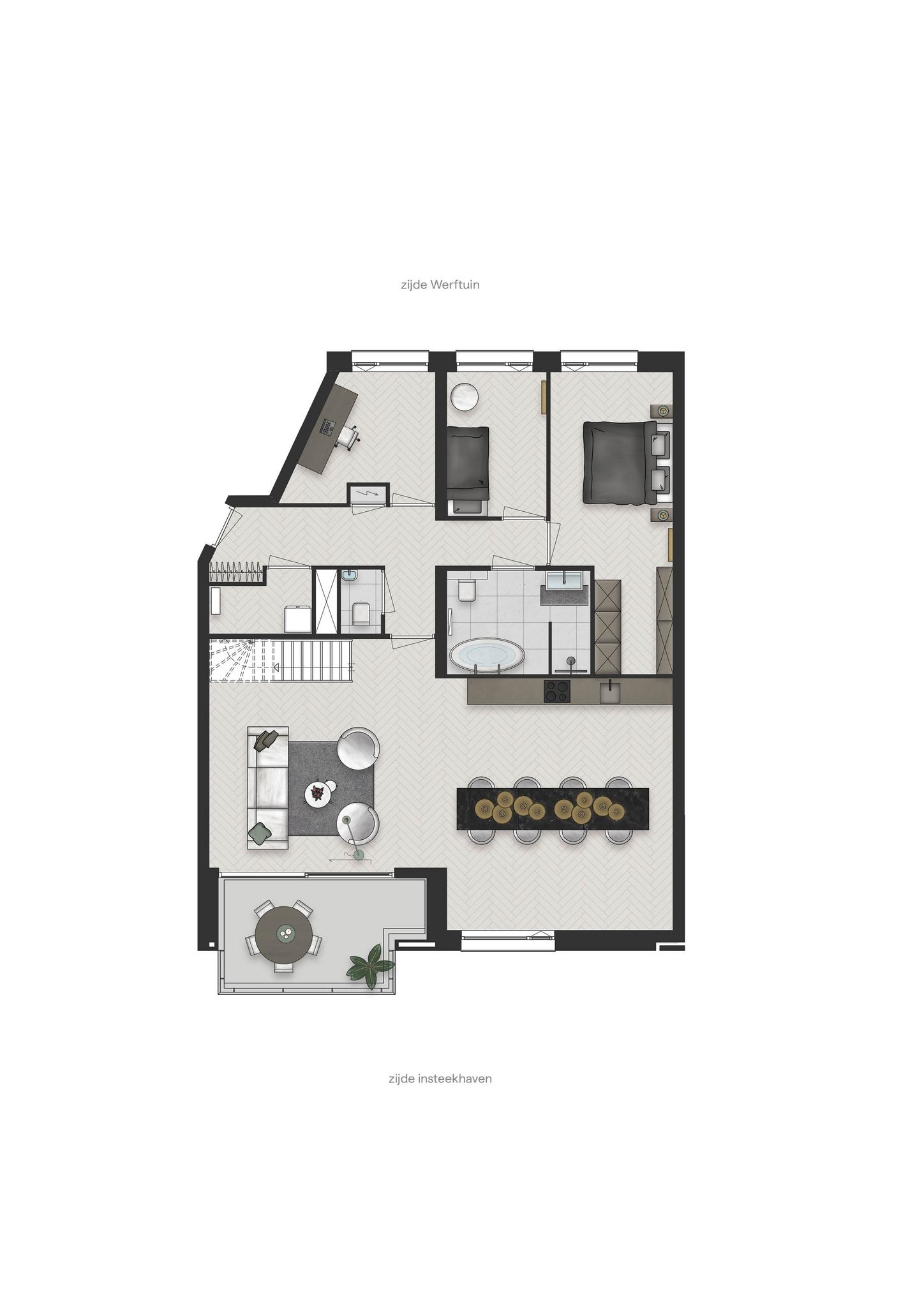 Een intieme verhoogde binnentuin, voorzien van volwaardige beplanting. Hier treft u een speels wandelpad en voldoende ruimte om plaats te nemen tussen de elzen, heesters en sierfruitbomen. Een plek waar u andere bewoners en bezoekers kunt ontmoeten. In direct contact met de rivier, de werf en de sfeervolle dijk is de Werftuin een heerlijke plek om te verblijven. Kom binnen door de poorten aan verschillende zijden van De Oude Werf of benut de unieke entree via de brug vanuit de stallinggarage. Hiervandaan hebt u vrij uitzicht over de dijk en de Hollandsche IJssel terwijl u de rust van de achterliggende tuin nadert.