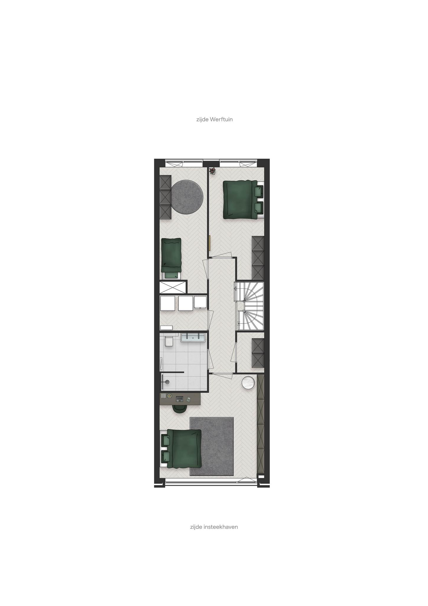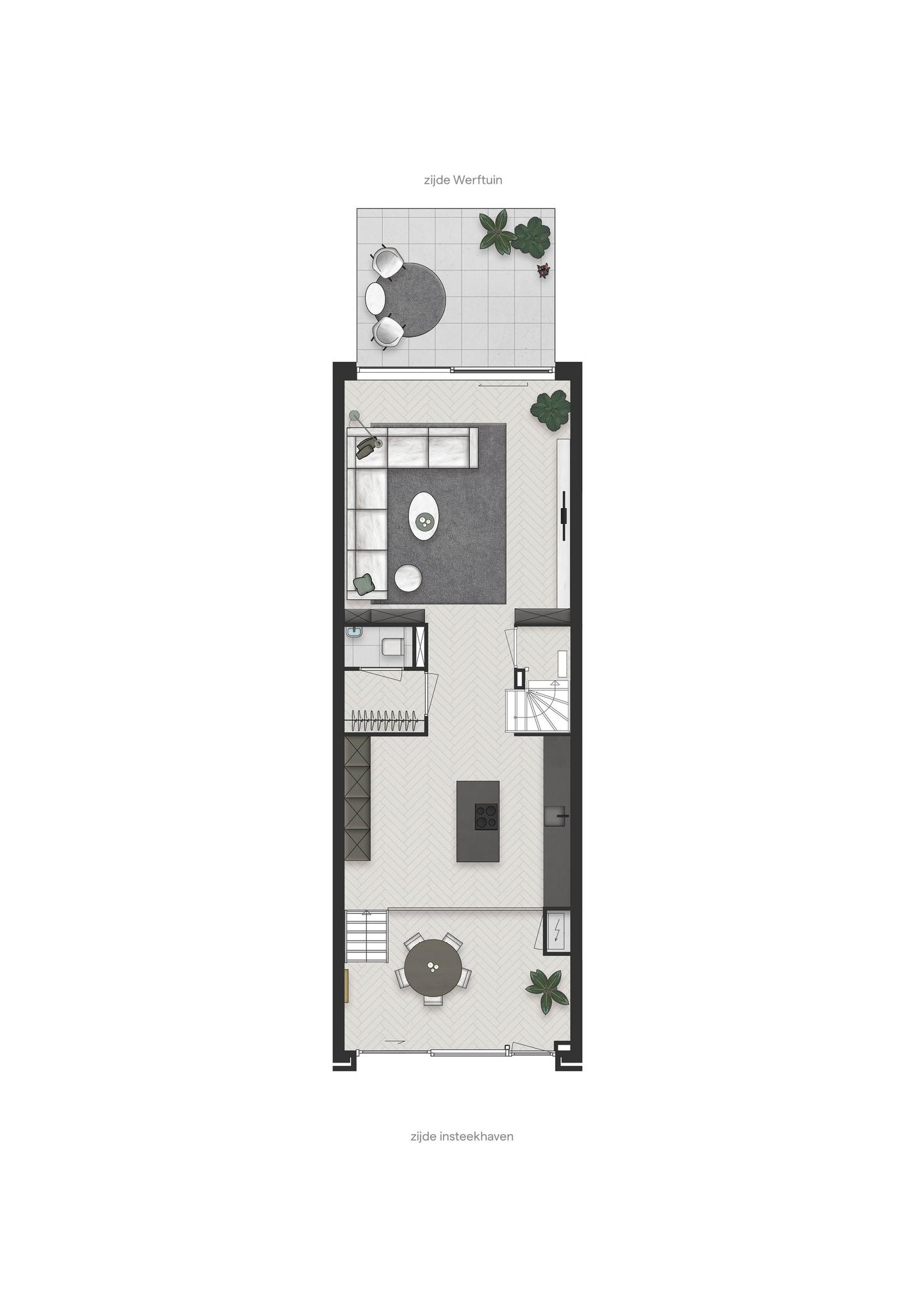 De stadswoningen hebben een eigen voordeur aan de straatkant, waardoor u direct aan de kade woont en op de verdieping kunt slapen. De achtergelegen Werftuin en de ruime balkons bieden bewoners de gelegenheid om zich even terug te trekken en te genieten van deze inspirerende nieuwe woonomgeving. Wonen in het Scheepshuis brengt u een unieke manier van leven langs een van de oudste dwarshellingen van Nederland.